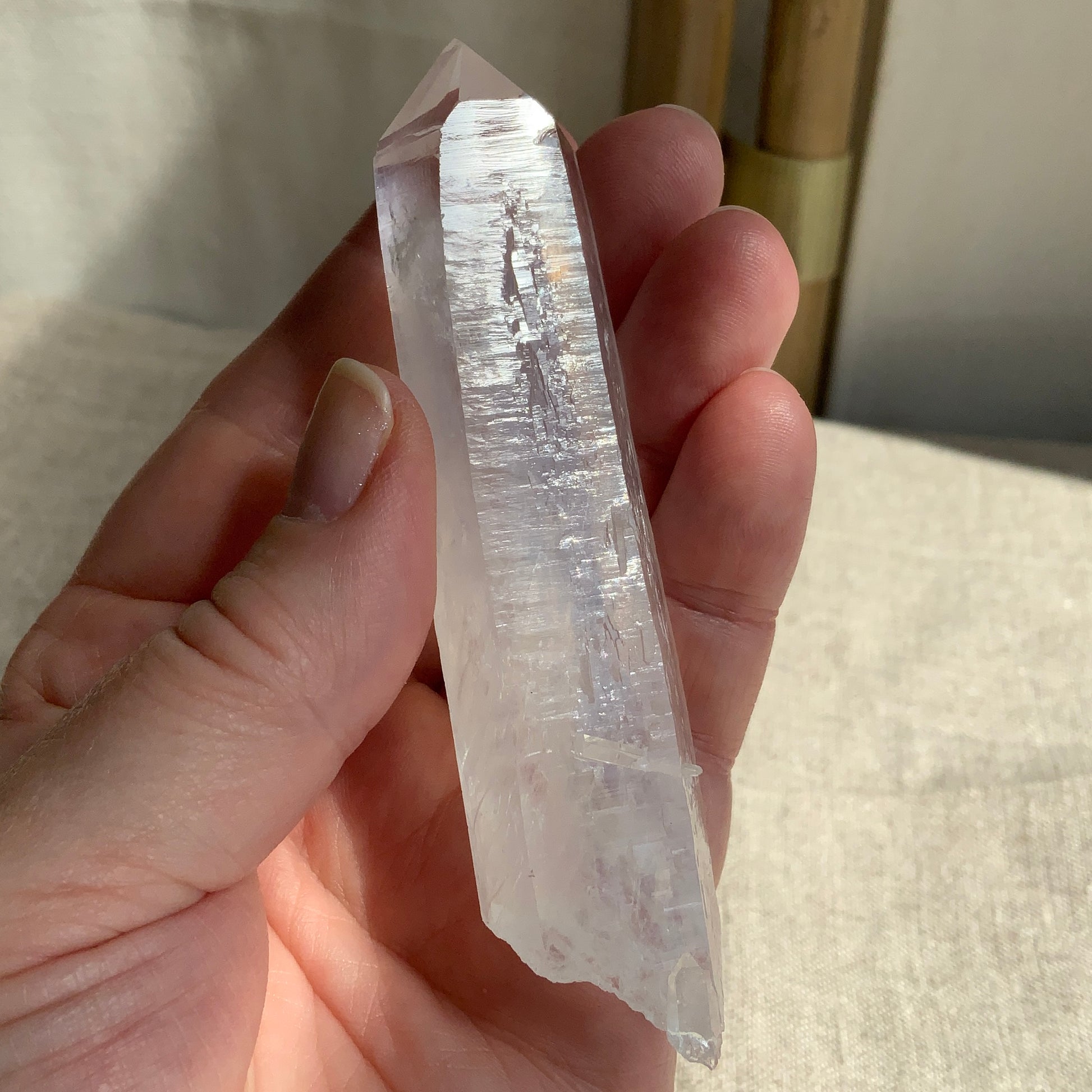 (in the photos you can see how the light plays off of the sides) They have angel hair-like blue and white inclusions of a lithium minerals throughout their bodies. Earlier finds of Blue Smokes were rich with inclusions of Cookeite. These Blue Smoke Wands have inclusions made up primarily of Tremolite. Blue Mist Quartz of this size and even coloring are rare and feel very wonderful in the hand. They will make wonderful additions to any collection! Must haves' indeed.