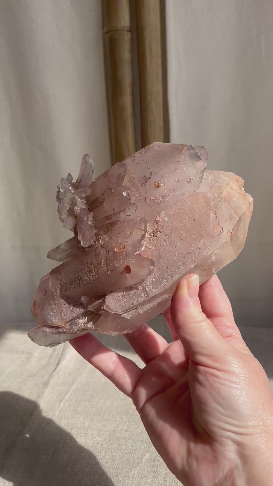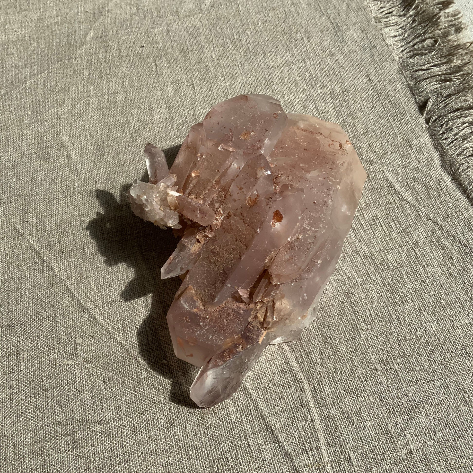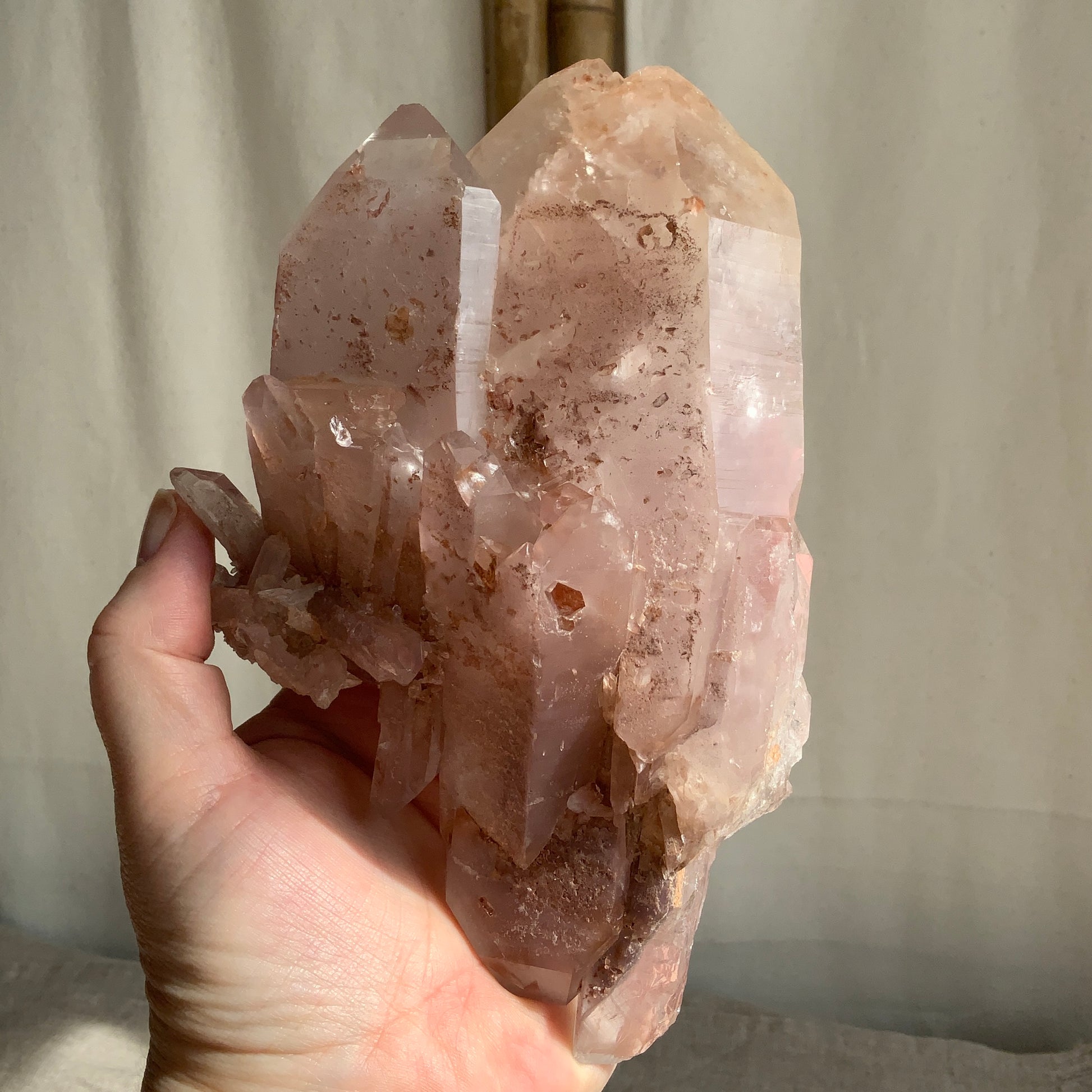 This beautiful unique chunky rare double terminated Pink lithium Quartz cluster is hard to find, this statement piece is a treat for raw crystal collectors. On the back side of this piece there are small rainbows & gorgeous key indentations. The colour in this cluster is sooo pretty & very pink with golden iron inclusions. Very special in every way.